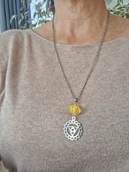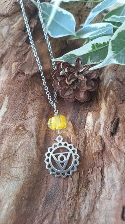 Ce pendentif unique, créé avec une intention profonde de confiance et de force intérieure, représente le chakra du plexus solaire. Ce centre énergétique, appelé en sanskrit Manipura, se situe dans la région de l’abdomen, juste au-dessus du nombril. Manipura, qui signifie « cité des joyaux », est associé à la puissance personnelle, à l’estime de soi et à la volonté.